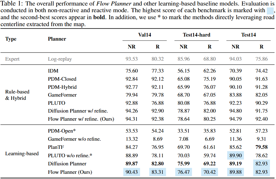 Flow Planner在大规模真实世界规划基准 nuPlan 上实现了学习型方法的SOTA性能,在Val14基准上首次突破90分大关,且不依赖任何规则先验或后处理模块;在引入同样的基于规则的后处理模块后,Flow Planner的表现与最优的混合式方法相当甚至更优。