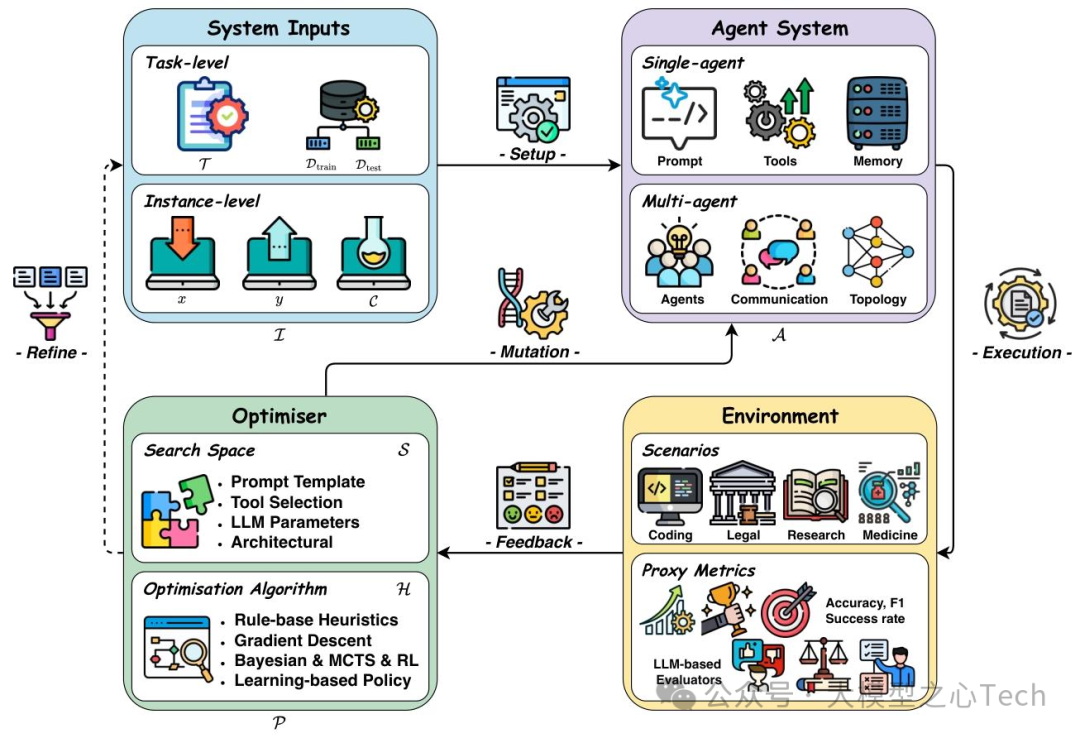为了让不同领域的研究者有统一的分析视角,论文提出了“系统输入-智能体系统-环境-优化器”四组件反馈循环框架,这也是整篇综述的核心理论贡献之一。