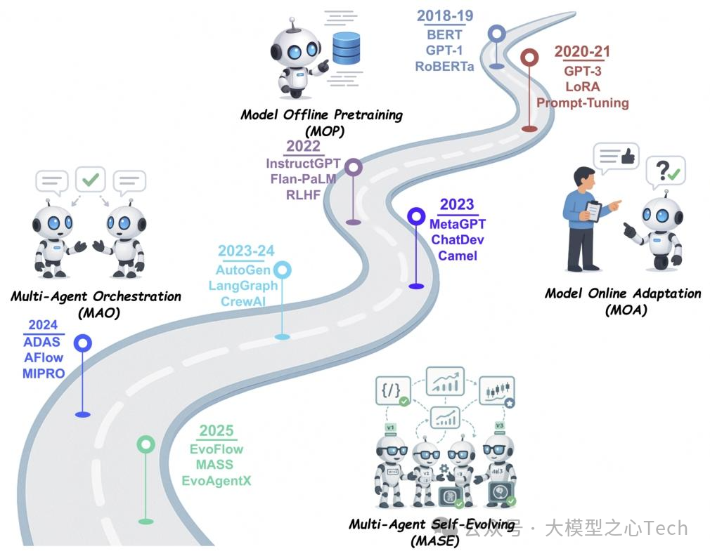 在此基础上,论文梳理了LLM驱动智能体的四阶段演进历程,清晰展现了从静态到自进化的技术跃迁: