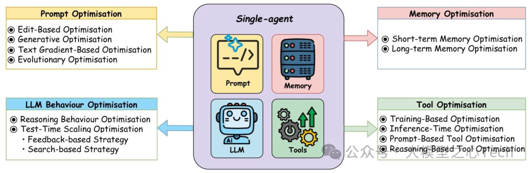 智能体系统是优化的直接对象,可分为单智能体和多智能体两种形态: