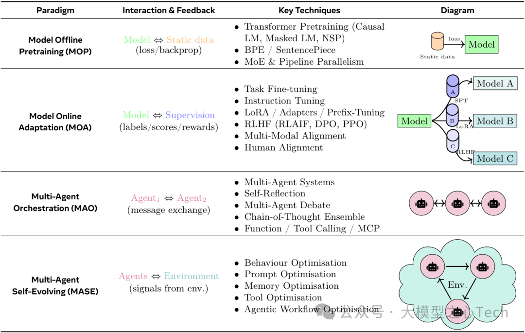 自进化多智能体系统是MASE范式的核心,论文重点介绍了三类技术: