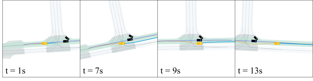Flow Planner在nuPlan的闭环测试中展现出充分的环境理解能力,能够在与周车、行人的复杂博弈场景中展现出灵活的轨迹规划与生成能力:无论是路口人行横道,还是路边他车无保护驶出,Flow Planner都能够准确判断其他交通参与者的行为意图,并作出快速精准的反应。