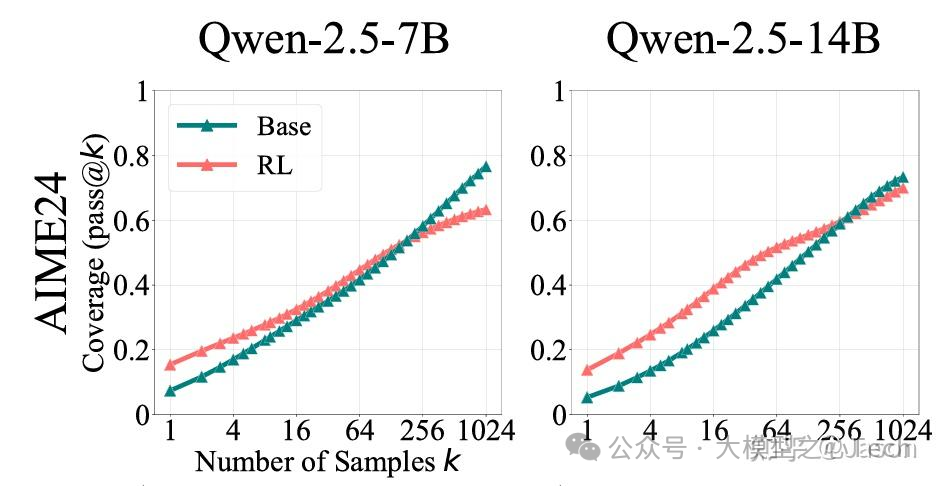 如果让Base Model无限次数回答问题,其正确的概率比RL过的模型更高:在《Does Reinforcement Learning Really Incentivize Reasoning Capacity in LLMs Beyond the Base Model?》这篇文章中,作者做了较为详细的Ablation,增加pass@k中k的次数,随着Sample的次数增加,RL能答对的累加概率逐渐不如Base Model;