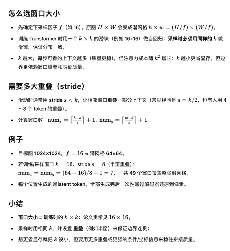 具体做法就是把整张大图在VQGAN 的潜空间网格上,分成可承受的小窗口(如 16×16 token)来做自回归预测;采样时让这个窗口在整张图上滑动,每次只让 Transformer 关注窗口内及与前一窗口的重叠上下文,从而把注意力的开销从 降到近似 (k为窗口边长)。