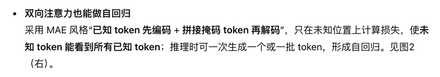 推理时的自回归:一次生成一个或一批未知 token,把它们的预测值并入“已知集合”,再进入下一步,直至全图填满。这样的“下一(组)token 预测”就是自回归,只是体系结构用的是双向注意力也就是mask和非mask之间的因果,而非前后因果掩码而已。