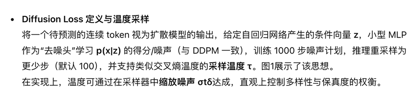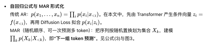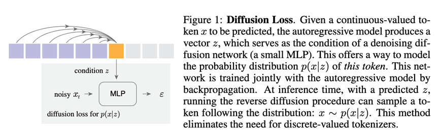 不用离散化/码本也能做自回归图像生成:作者提出将每个token 的条件分布p(x∣z)p(x|z)p(x∣z) 用一个扩散过程来表示,于是 token 可以是连续值而非 VQ 离散索引;训练时用“Diffusion Loss”取代传统交叉熵,从而摆脱 VQ(向量量化)的依赖。