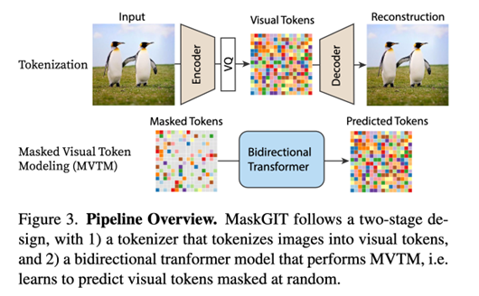 并且采用maskGIT的思路,并不是rasterized方式,一个个按顺序预测,而是采用随机mask随机预测的方式,逐渐补全整张图片。