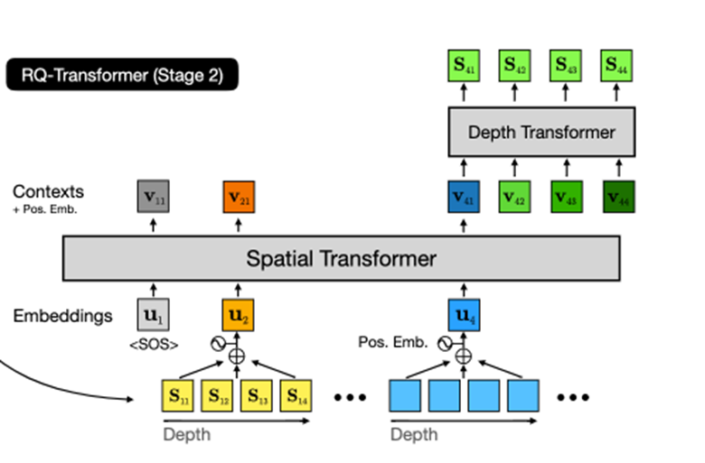 细节比较多,看下原文吧。这里说一下推理,由于前面的vq方式发生了改变,这里多了一个深度D维度,所以transformer分成两个构型,一个是空间的spatial transformer,然后还有一个depth transformer: