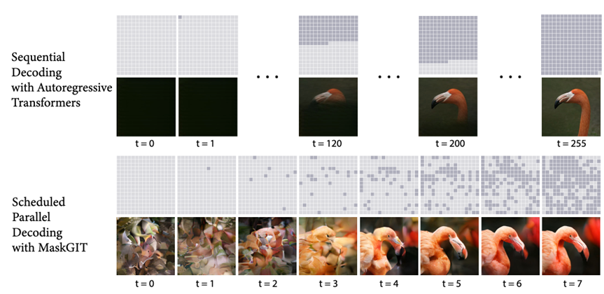 近年的意见认为顺序 AR 太慢,MaskGIT 以“随机掩码+迭代并行填充”的范式在速度与质量上取得强竞争力,弱化严格的自左到右生成。