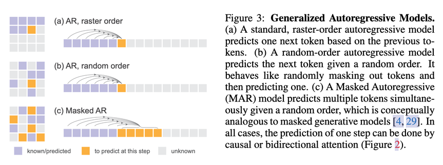 统一 AR 与 Masked AR(MAR):作者把“随机顺序 + 双向注意力 + 一步预测多个 token”的 MaskGIT/MAGE 类方法形式化为广义自回归(“下一组 token 预测”),并论证双向注意力也能做自回归。