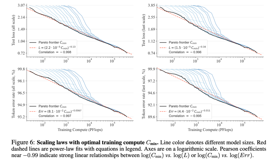 实验结果强调两点是,一个是scaling law,通过不断增大参数量,可以看到test loss and token error rate在不断降低,其次同样的模型,增加traning compute,也存在scaling: