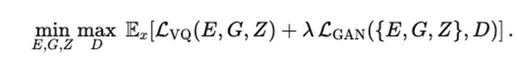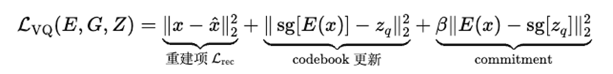 VQ-VAE 对编码器 EEE、解码器 GGG、码本 ZZZ 的联合目标: