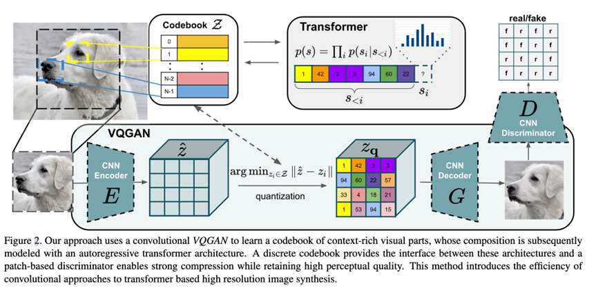 提出 VQGAN 作为更强的第一阶段表征:用感知重建损失+PatchGAN 判别器替代纯 L2,使在更高压缩率下仍有较好感知质量;这一步显著缩短 Transformer 的序列长度,是能上高分辨率的关键。