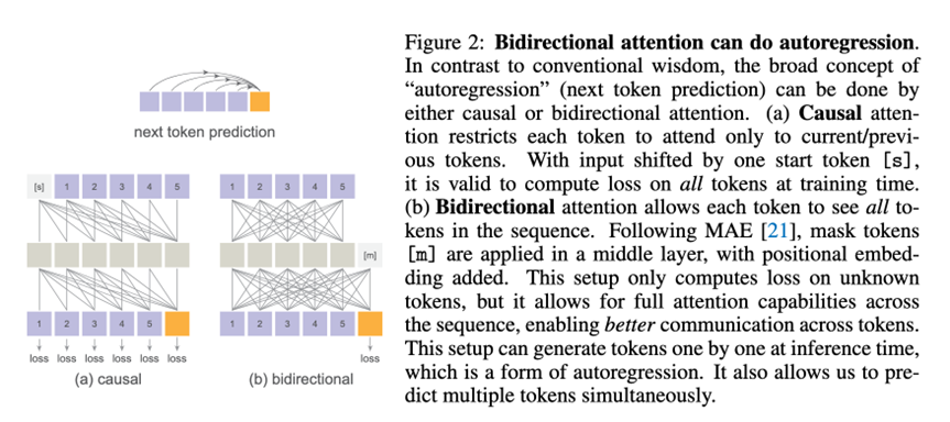 这个是MAE风格的操作,自回归的本质是条件化(只用“已知”去预测“未知”),与“用因果注意力还是双向注意力”无直接冲突,说白了只是不同的实现方式。论文明确指出“自回归可以用因果或双向注意力实现”,目标只是“给定之前的 token 去预测下一个/下一组 token”。