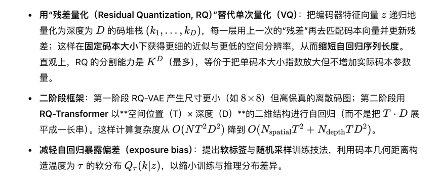 码本效率:多尺度/残差量化提高逼近能力,类似 RQ-VAE/RQ-Transformer 的“叠残差码栈”思想,早在 RQ-VAE 路线已验证有效。