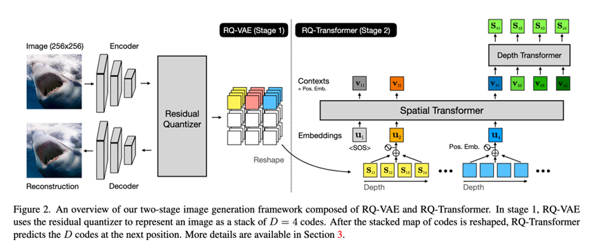 同样的,rq-vae也是两阶段学习,第一阶段的区别在于学的不是vq而是vq的residual;第二部分,由于第一阶段任务的改变,每个patch的表达方式变成了多个code-book词表的残差和,所以对应的transformer的学习任务也发生了微调。整体上架构是和vq-gan相同的,具体的操作上发生了改变。文中也强调了,这个学习residual地intuition就是希望能使用不同codebook词表表达图片的不同信息,从框架到纹理。