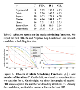 整体的采样decoding策略是:“并行预测 + 基于置信度的重掩 + 多步 refinement”策略,关于masking比例调度有一个对比,这里最后采用的是cosine scheduling。解释是“Concave function captures the intuition that image generation follows a less-to-more information flow. In the beginning, most tokens are masked so the model only needs to make a few correct predictions for which the model feel confident. Towards the end, the mask ratio sharply drops, forcing the model to make a lot more correct predictions. The effective information is increasing in this process. The concave family includes cosine, square, cubic, and exponential.”对于预测早期,不确定性大,所以不需要准确预测太多token,随预测次数增加,可以快速增加准确预测tokens的数量。下面左图是算法结构,右图是不同调度方式。只要是起点为1,终点为0的任何调度方式都可以,y轴表示的mask比例。