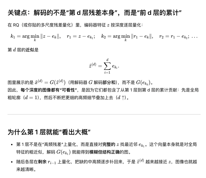 ★这让我想起了flexvar中的图片,如上面右图所示,说使用residual不能重建出任何东西,这样的对比其实没意义,应该使用累积和进行重建,所以使用residual 预测照样可以在每层重建出语义信息。所以flex-var文章强调的重点“连续语义:不以“上一层累计重建”作为必须条件,而是直接对齐“真值”,从统计学习角度更像一致的似然因子分解,强调相邻尺度的语义连续(作者认为更利于建模扩展的概率分布)。”其实站不住脚。var没有类似rq-vae的图是因为它根本没想到有人会用residual去decode图片。