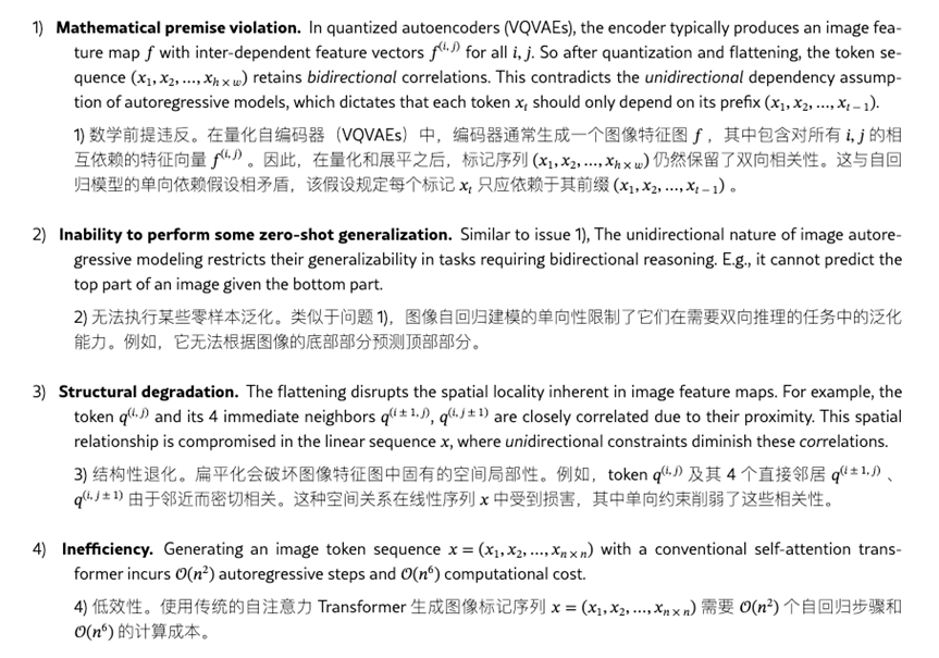有一点考虑图片与文本序列的一大区别是图片在空间上有关联性,所以虽然做ar生成,但是每次都会和当前patch附近的空间区域做attention。但是VQ-GAN,或者MaskGIT方法,没有scale的概念,和语言序列的最大区别之一,就是图片的邻近空间相关性,从这个角度上讲,上面两个方法都没有很好处理图片生成的这个特点,所以文章首先列举了图片生成的痛点问题: