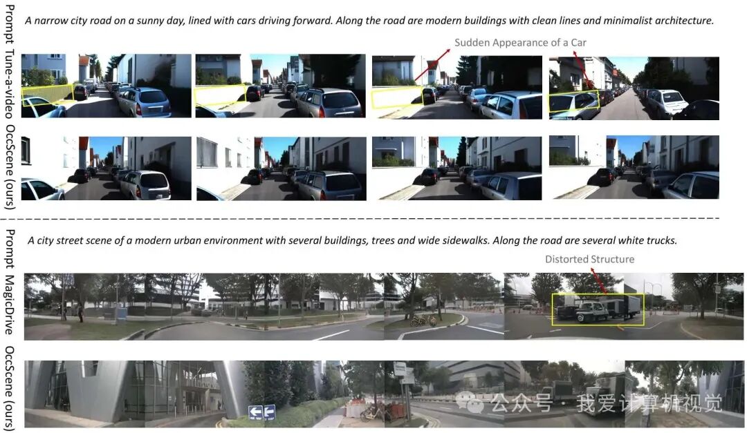 定性分析:相比传统方法,OccScene生成的场景在几何上更合理(如车辆形状正常),细节更清晰(如远处景物),并且在跨视角视频中保持了高度的逻辑一致性。