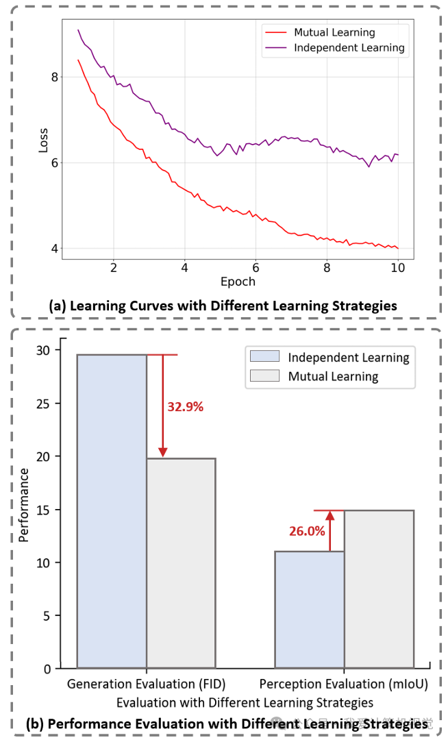 理论支撑 (协同进化) :通过互学习机制推动模型找到更宽、更稳定的损失谷底,避免了独立学习中可能出现的局部极小值停滞问题,实现了生成与感知的协同进化。