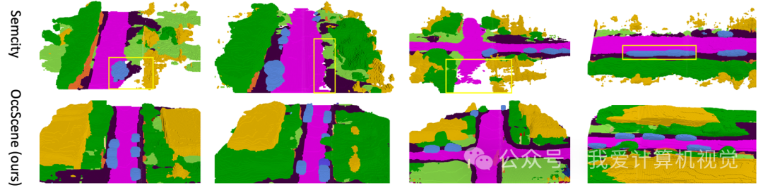 在3D语义场景生成上,OccScene能生成更完整的场景和更精细的物体结构。