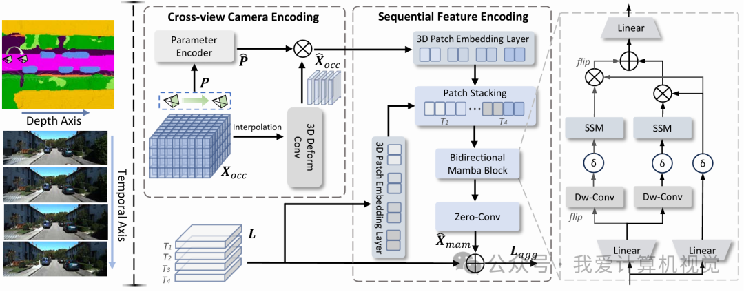 跨视角相机编码与对齐:通过可变形3D卷积和相机参数编码,为每个视角的生成过程提供与之匹配的、视角感知的Occupancy特征,从而保证了视频生成时序上的一致性。