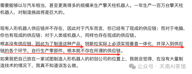 现有人形机器人供应链并不存在。对于汽车而言,已经有了现成的供应链;对于电脑,你也有现成的供应链。