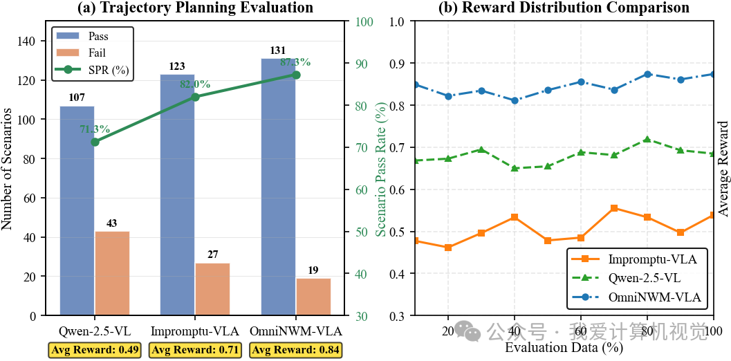 为实现真正的闭环仿真,OmniNWM 引入了一个专用的 Vision-Language-Action(VLA)规划器,命名为 OmniNWM-VLA。该模块基于强大的多模态大模型 Qwen-2.5-VL 构建,但针对自动驾驶场景进行了关键性增强,使其能够 理解多模态环境、推理驾驶意图,并输出高精度轨迹。