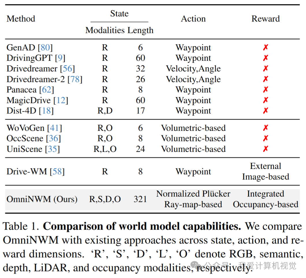 表1:OmniNWM 与现有世界模型在状态、动作、奖励三个维度的能力对比
