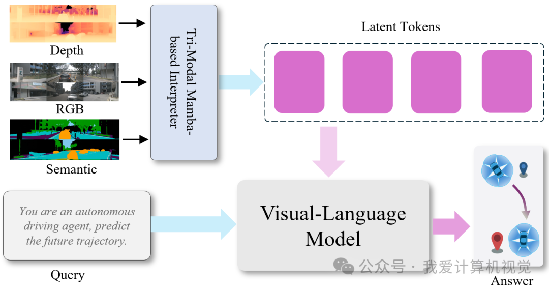 OmniNWM-VLA 的核心创新在于其 Tri-MIDI 融合模块——一个轻量、即插即用的 Mamba-based 多模态解释器,用于将 RGB、深度、语义三路输入统一编码为富含空间语义的潜在表示。 具体流程如下: