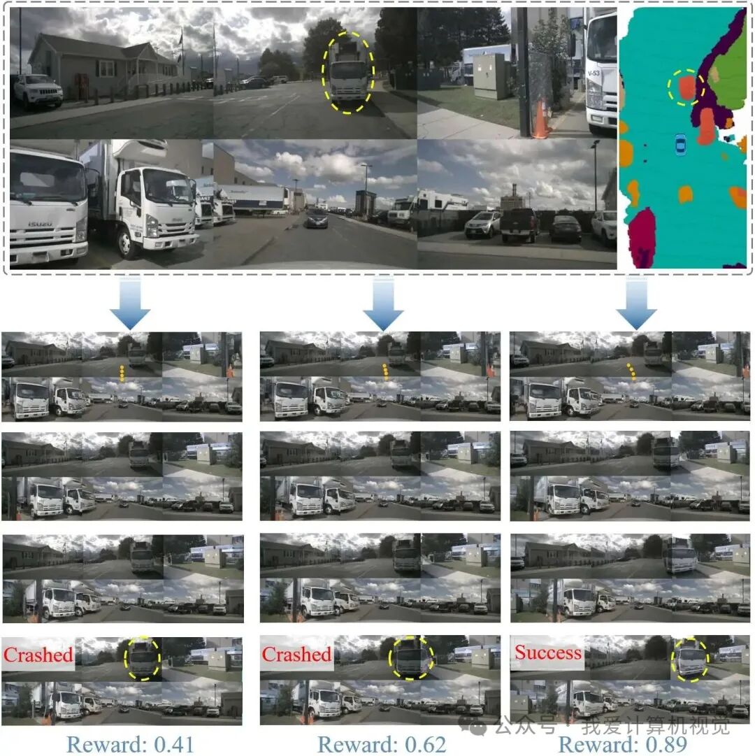 🎯 验证:下图展示在“对向卡车”场景中,奖励函数能有效区分碰撞、避让不足、成功规避三种行为。