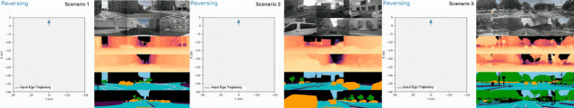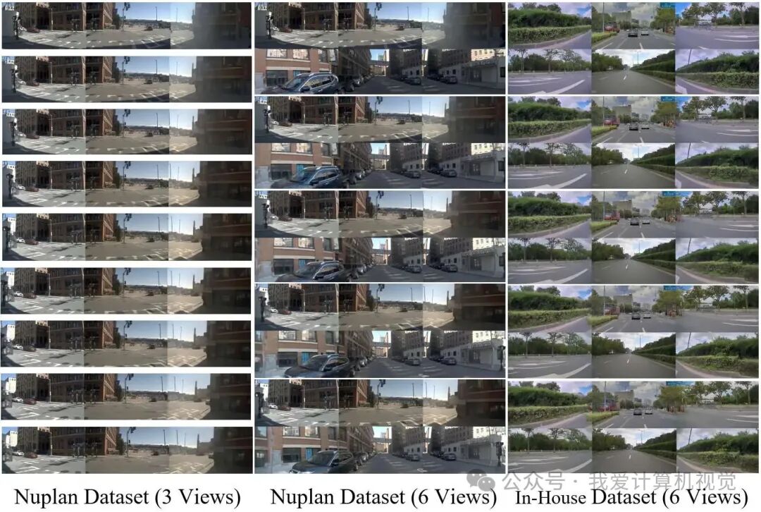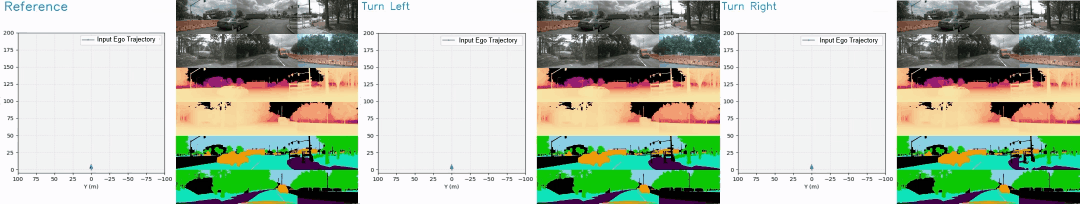 原始 NuScenes 数据集中轨迹分布高度集中(如主干道直行),限制了模型对复杂驾驶行为(如急转弯、倒车、变道切入)的建模能力。OmniNWM 的归一化策略 解耦了轨迹几何与具体相机配置,使得在训练或推理时可轻松注入 OOD(Out-of-Distribution)轨迹(如图中 control.gif / reverse.gif 所示)。