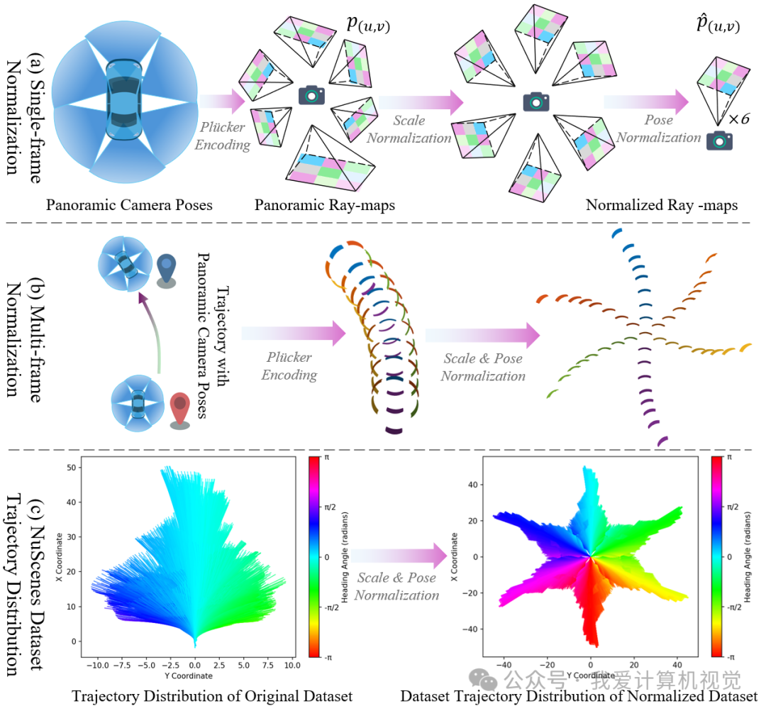 位姿归一化(统一坐标系):将所有相机中心与射线方向变换至前视相机坐标系下。