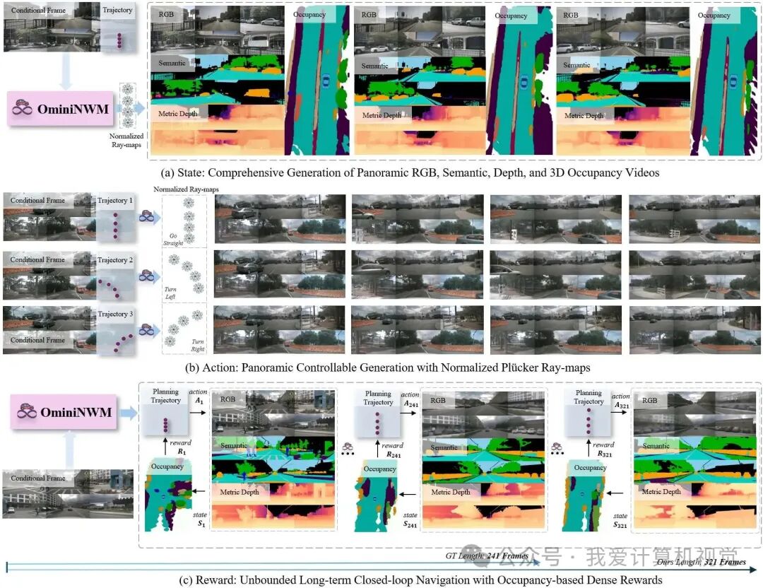 (a) 根据参考图像和输入轨迹,OmniNWM可联合生成全面的多模态输出,包括全景RGB、语义、深度和3D Occupancy视频。