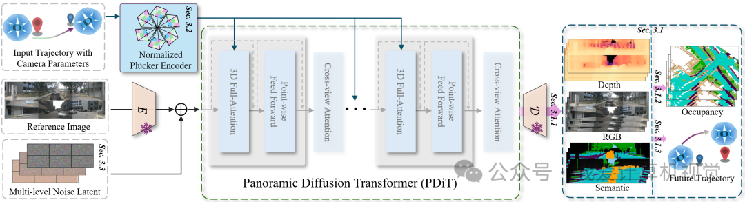 全景多模态生成 (State) :利用 Panoramic Diffusion Transformer (PDiT) 作为核心,联合生成像素级对齐的 RGB、语义、深度、3D Occupancy 四种模态的视频。