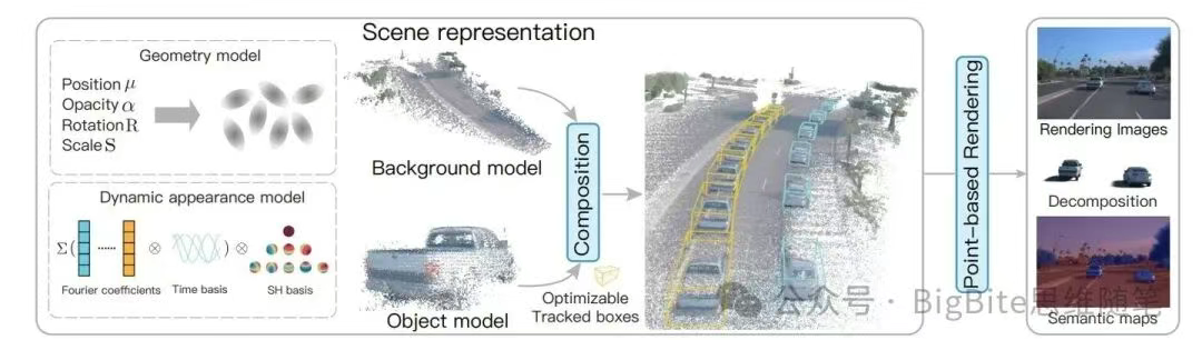 这里简单介绍下3D Gaussian,它是目前在3D重建领域非常流行的一种表征方式,基本上他利用了众多具备位置信息,作用范围(协方差),以及相应颜色,透明度属性的高斯椭球体对场景进行表征,然后再利用投影关系将可微分性能良好的高斯椭球投影到图像平面进行可微分渲染,并利用渲染出来的图像与相机捕捉的真实图像差异作为监督信号对场景重建表征进行优化,最终达到照片级的逼真场景重建效果。相比点云或多边形,3D高斯表达更高效可微;相比NeRF等隐式表达,其几何信息更明确,因此3D Gaussian成为了目前自动驾驶领域最主流的场景重建表征。
