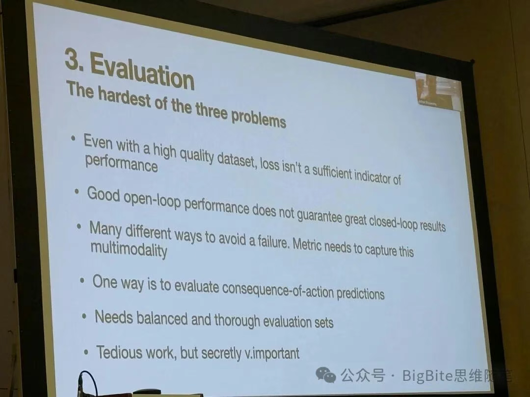 Ashok本次分享的最重要的观点莫过于完善的评测体系对于端到端系统的重要性了。上面这页PPT可以说每一条信息都代表了Tesla AI团队对于端到端自动驾驶的核心认知。