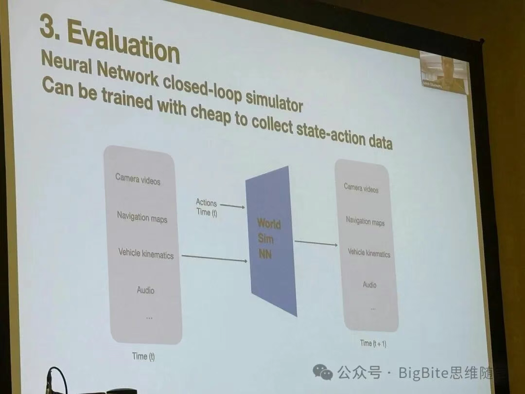Tesla完善的评测体系中的核心就是基于神经网络的闭环仿真系统。这个仿真系统可以通过收集大量廉价的离线状态-动作数据对进行训练。Ashok展示了这样的闭环仿真系统的几大作用: