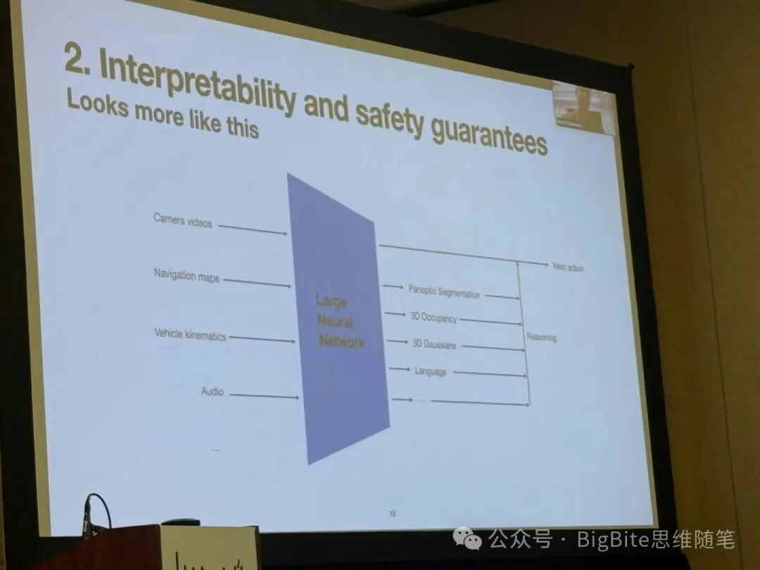 编码人类价值判断的复杂性:Ashok现场举例说明了自动驾驶中常见的两难抉择,例如车辆在遇到路边水坑的双向单车道上,是应该稍微偏离车道绕开水坑,还是严格避免侵入对向车道?基于预设规则很难完美定义此类情境下的合理行为。而端到端系统通过大量学习人类驾驶数据,能够掌握这些细微的价值权衡,在恰当时机做出类似“借道绕行”的决策。