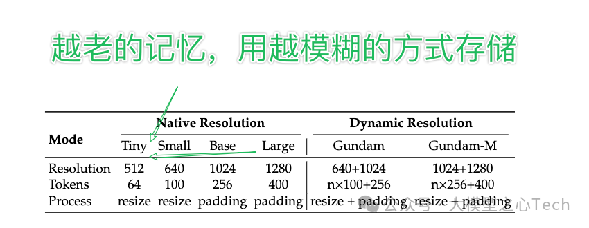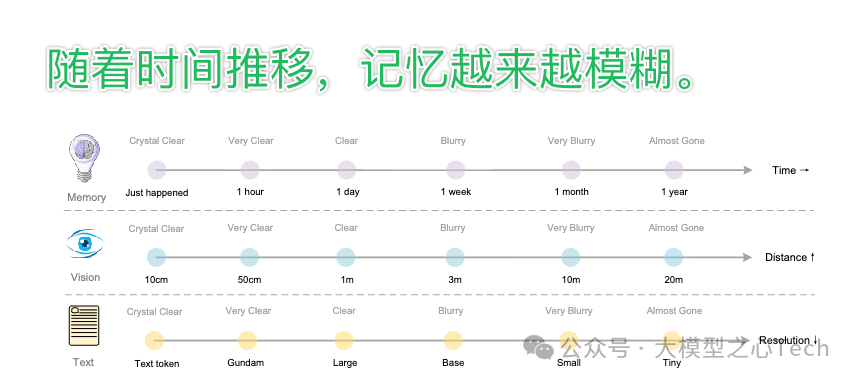 而随着时间的推移,这件事的重要性也会逐渐降低,存储它的格式也会从最大的 Gundam 一路降级,从 Large 一路降到最小的 Tiny,占用的 token 数量也会越来越少。