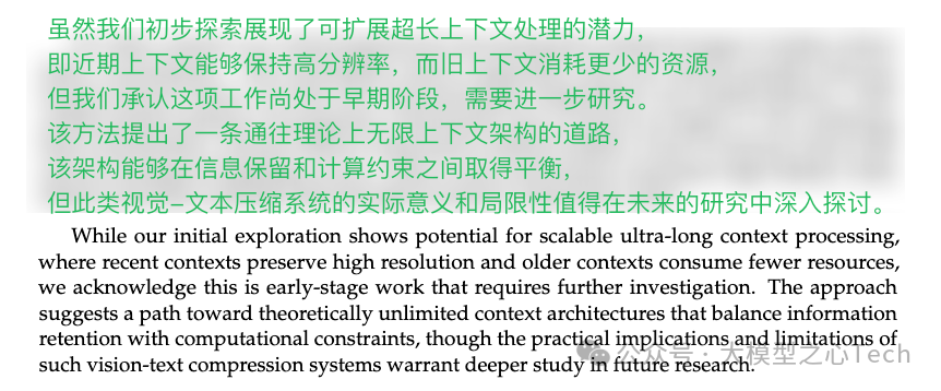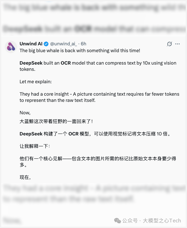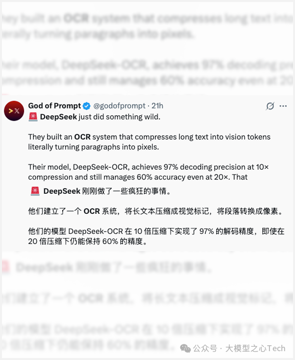 但是 DeepSeek 这次的 「技能 OCR」则是刚好相反,它可以把大量文字变成一张图片,作为 AI 的“记忆载体”。