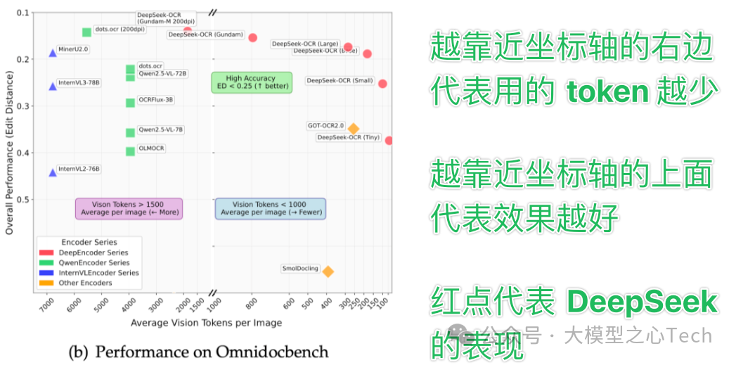 在论文里可以看到,初出茅庐的 DeepSeek-OCR,就能用原本 1/10 的token 数量,达到原模型 96.5%的准确率。