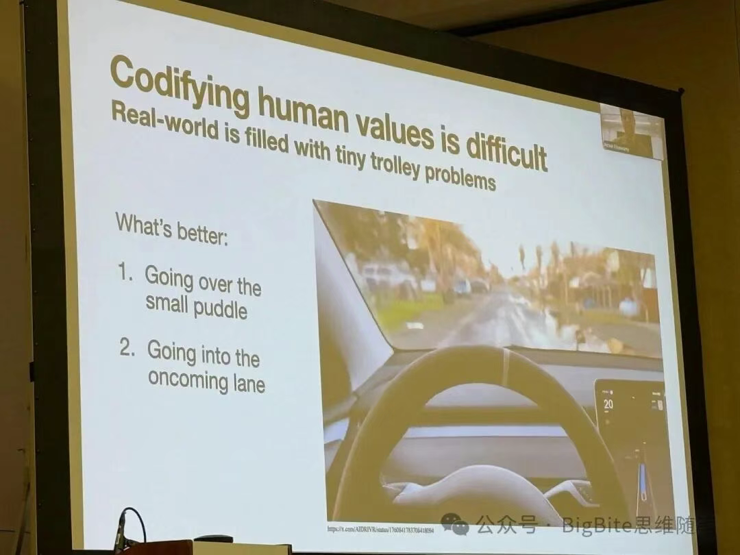 编码人类价值判断的复杂性:Ashok现场举例说明了自动驾驶中常见的两难抉择,例如车辆在遇到路边水坑的双向单车道上,是应该稍微偏离车道绕开水坑,还是严格避免侵入对向车道?基于预设规则很难完美定义此类情境下的合理行为。而端到端系统通过大量学习人类驾驶数据,能够掌握这些细微的价值权衡,在恰当时机做出类似“借道绕行”的决策。