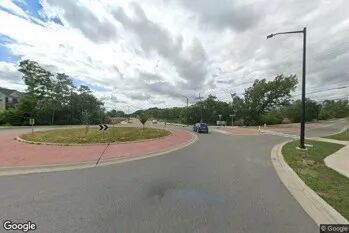 ★“郊区环岛路口,红色路面铺装,草坪圆形绿岛,天空多云光照柔和,周围树木茂密环境开阔。”
