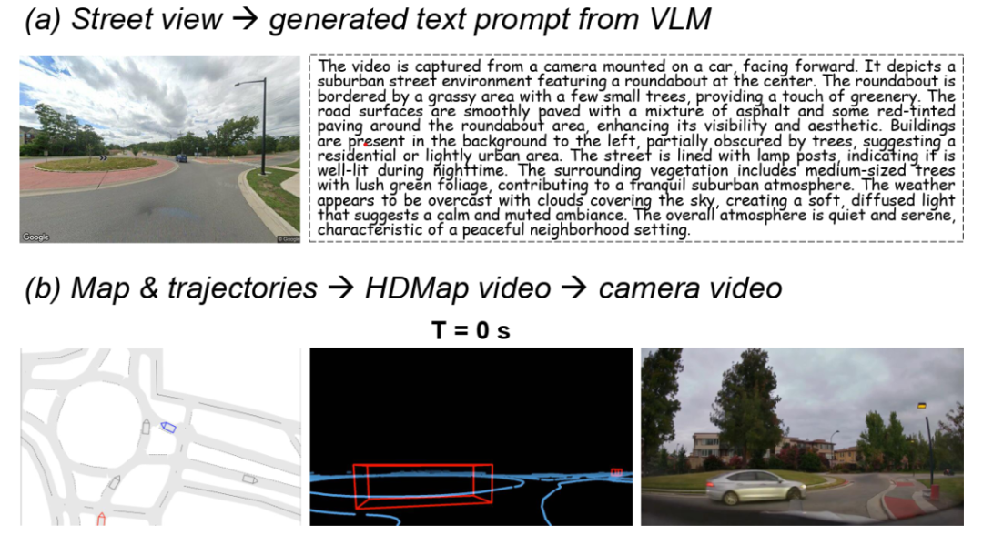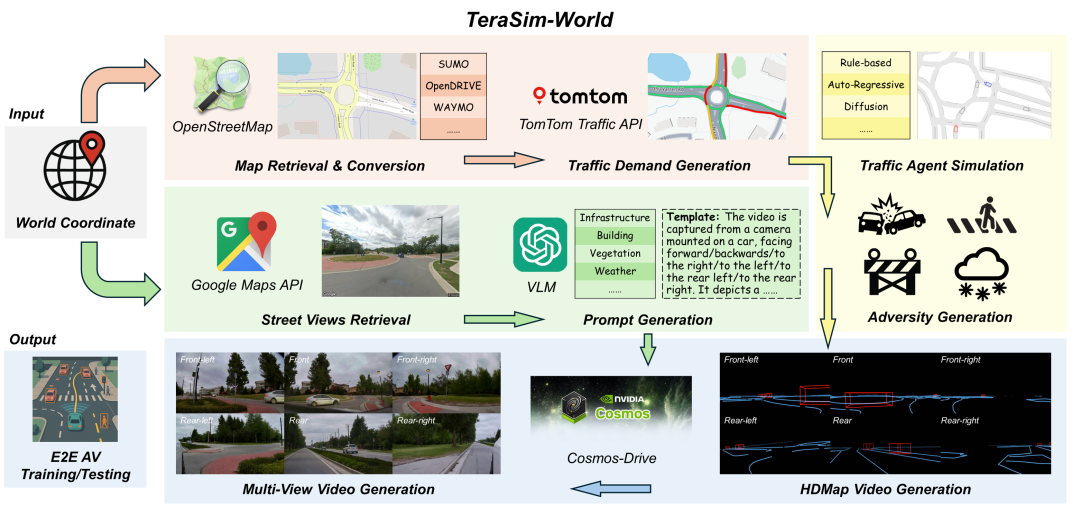 系统从任意全球坐标出发,首先1) 自动检索真实世界的道路地图,并将其转换为仿真可用的格式,使其能与不同类型的智能体行为建模后端集成。接着,交通需求生成模块根据实时或历史交通源确定背景流量分布。2) 与此同时,提示生成模块利用街景图像和多模态语言模型(VLM)提取语义描述。这些提示捕捉静态环境特征,如建筑、植被、天气等,确保生成的视频在视觉上与选定地理区域一致。3) 在此基础上,智能体仿真模块生成所有交通参与者的轨迹,包括车辆、行人、自行车等。该模块继承自 TeraSim 框架,可同时生成自然驾驶与安全关键对抗行为。输出结果是一组与道路布局相匹配的智能体轨迹。4) 为了生成传感器级输出,TeraSim-World 首先将这些轨迹和地图布局渲染为多视角的 HDMap 视频,作为结构化的条件输入,再送入 Cosmos 模型。随后,Cosmos 生成时序一致且地理对齐的多视角视频。最终结果可直接用于端到端自动驾驶系统的训练、测试与基准评估。