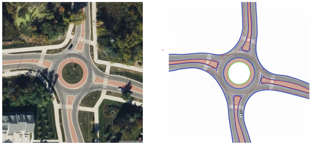 为了让交通更加真实,TeraSim-World 不仅能手动设置“多少车、多少行人”,还可以从实时交通数据服务(例如 TomTom API)中自动获取该地区的实际车流速度与拥堵状况,从而模拟出符合当地节奏的早晚高峰、拥堵点或空旷路段。下图是一个利用Ann Arbor的真实环岛自动化产生高精度地图的示例。