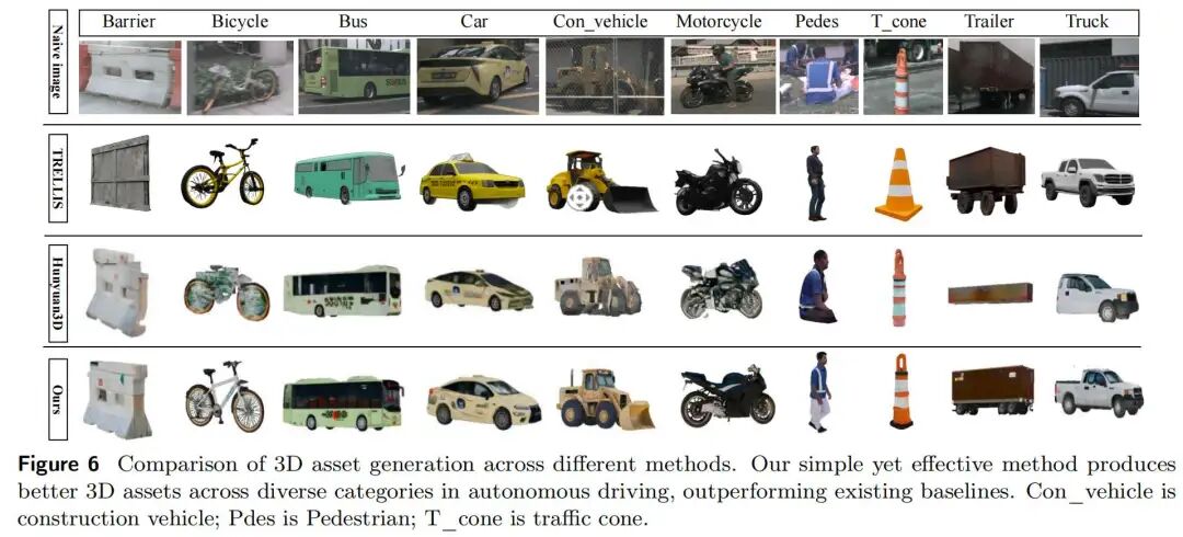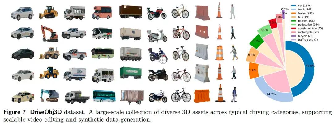 如图6所示,Text-to-3D方法生成的资产往往与原始数据存在风格不一致问题,而单视角方法则容易生成不完整的资产。相比之下,本文提出的简洁流程通过多视角合成生成完整且高保真的资产,即使在严重遮挡情况下也能保持性能。为支持大规模下游驾驶任务,本文构建了多样化的资产数据集DriveObj3D,涵盖驾驶场景中的各类典型类别(如图7所示)。所有资产将公开。