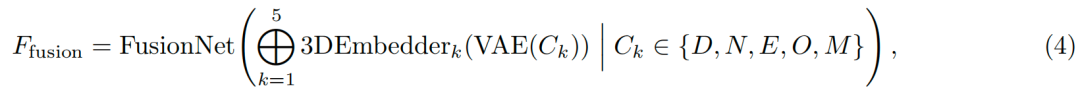 多条件融合适配器的结构如图4所示。首先通过变分自编码器(VAE)对五种条件(深度图、法向量图、边缘图、目标图像、目标掩码)进行编码,然后采用不同的3D嵌入器(3D embedders)对潜在变量进行分块(patchify)处理;随后,融合网络(FusionNet)模块对这五组特征进行融合,融合过程可通过以下公式描述: