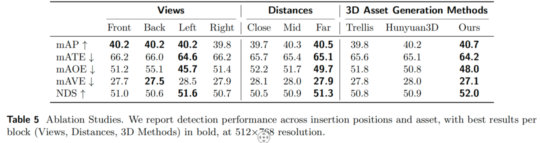 本文还在表5中分析了插入距离对性能的影响:近距离插入的性能往往较差,这可能是因为资产遮挡了相机视野,干扰了其他实例的训练;远距离插入的增强效果更优——由于检测器对远距离目标的检测能力通常较弱,增加远距离目标样本可显著提升检测性能。